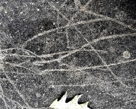 Next, watch for crescent shaped fractures in the rock surface. These are called chattermarks, they were formed when a boulder was dragged across this same surface. The weight of the ice pressed down, but the push of the glacier pushed it forward. When the push overcame the weight, the boulder “leaped” forward and “landed” leaving the crescent. Over time a series of crescents was formed.